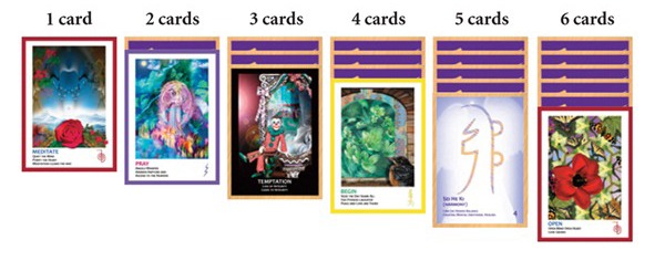 Six rows across are dealt. A Root Chakra card begins a sequence. There are 6 Root Chakra cards, so every sequence begins with a Root Chakra card. Following the Root Chakra, the order is: Sacral, Solar Plexus, Heart, Throat, Third Eye and Violet Crown Chakras. If no Root Chakra cards turn up, the Source Deck is put into play. Each Chakra contains 6 cards for a total of 42 cards.